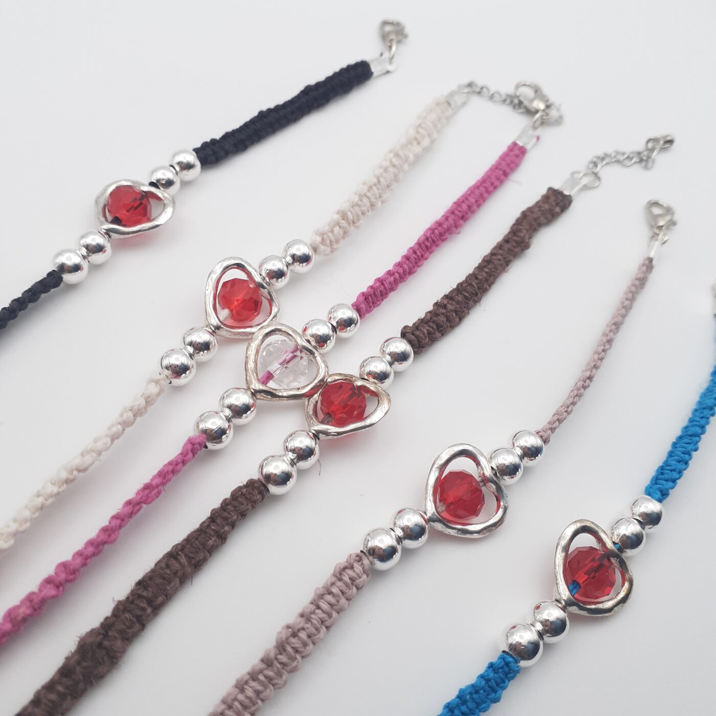 This is a delicate, minimalist and romantic boho-chic style thin hemp cord macrame bracelet. The centerpiece is an open heart-shaped polished metal charm with a clear faceted crystal inside that adds sparkle and sophistication. It is suitable for everyday wear, can be worn alone or stacked with other bracelets. Perfect for Valentine’s Day, anniversaries, birthdays, or as a thoughtful romantic, or, “Galentine’s” gift.  Vibrant pink. Lightweight for comfortable all-day wear. Fits 6.5 – 7 inches.