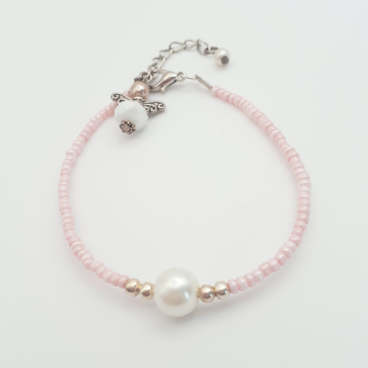 Thin Pink Seed Bead and Pearl Bracelet with an Angel Charm
