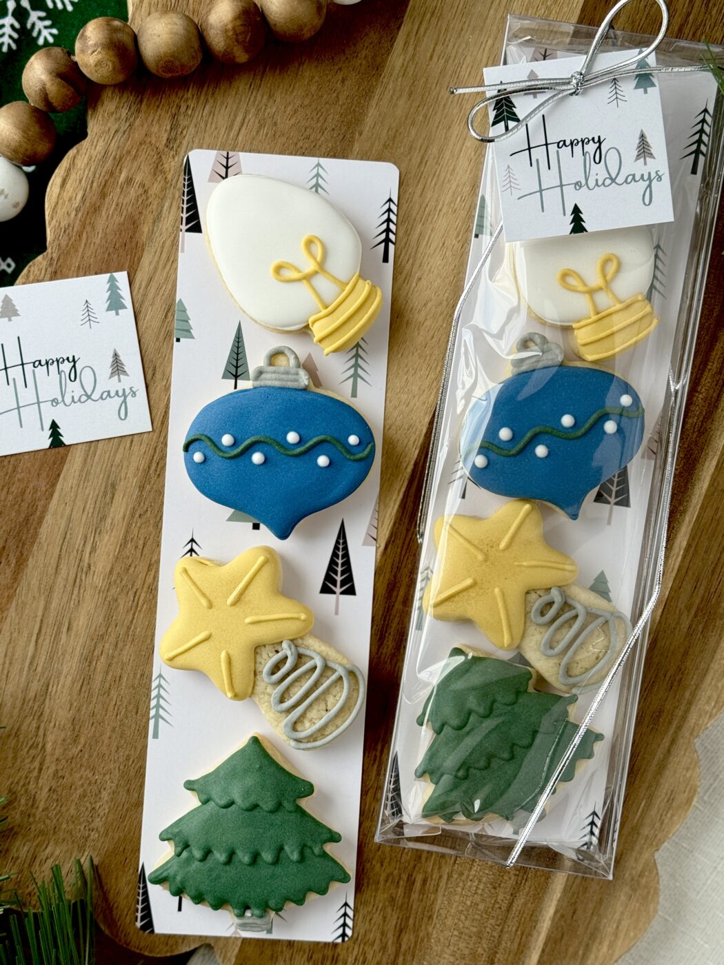This adorable and yummy collection of ‘Tree Ornament’ cookies includes 4 mini vanilla sugar cookies. Each cookie is approximately 2-2.5” in size. The set is heat sealed in a bag for freshness, packaged in a crystal clear box (3×10”), and finished with a bow and gift tag.