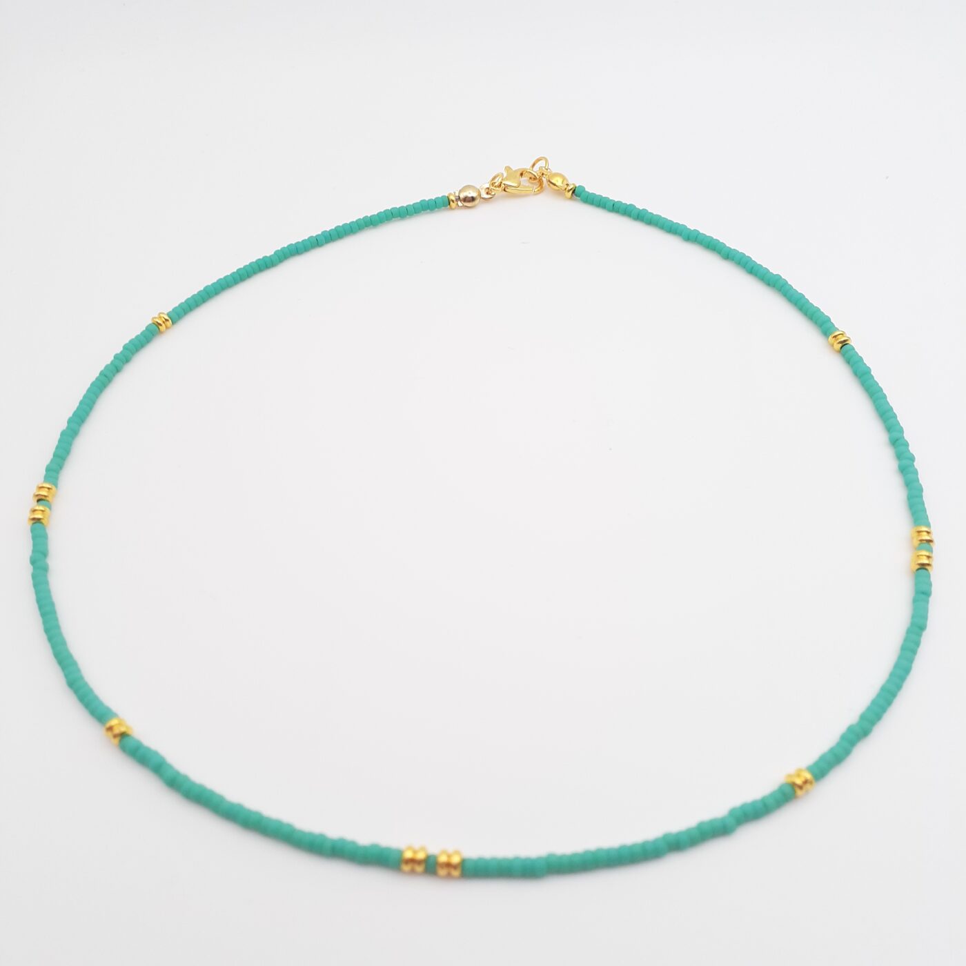 Turquoise Miyuki Glass Seed Bead and Gold Short Thin 16 inch Necklace