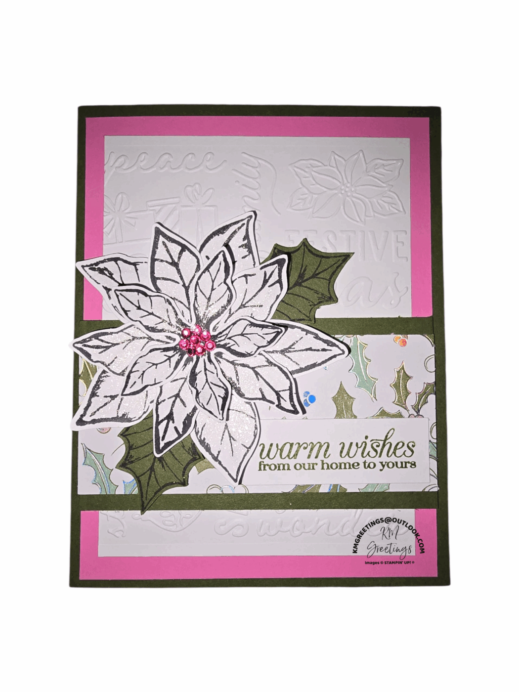 This handmade greeting card is very festive for the holiday season featuring a beautiful poinsettia on a textured background. This card does not have a message inside allowing you to customize your message. A perfect greeting card for the holiday season. Small embellishments add to the beauty of this card.