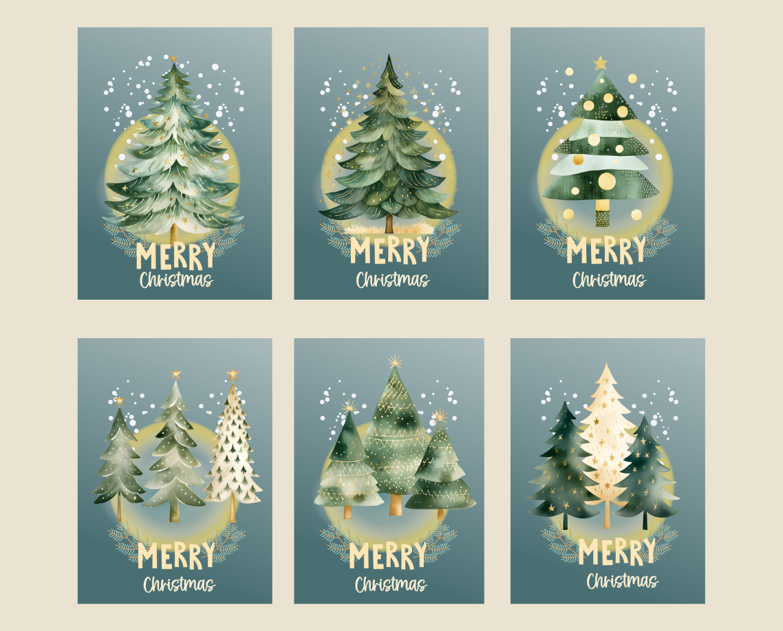 Set of 6 elegant holiday cards featuring beautifully watercoloured Christmas trees, printed on premium quality paper. Perfect for sending heartfelt holiday greetings in a stylish, artistic way.