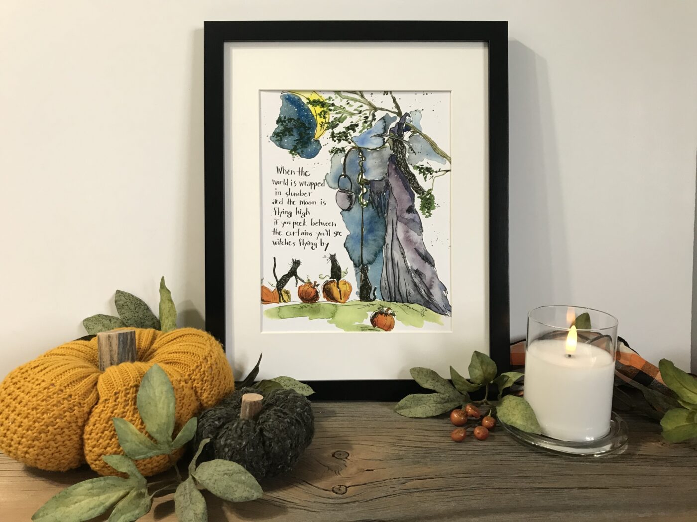 Part of my Autumn Collection. This piece captures the soft and cozy colours of Autumn, featuring a witch and 3 cats sitting under the moonlight with the message: “When the world is wrapped in slumber, and the moon is flying high, if you peek between the curtains, you’ll see witches flying by.” Such a perfect decor piece for the harvest season and beyond. Micron ink pen and watercolour design.