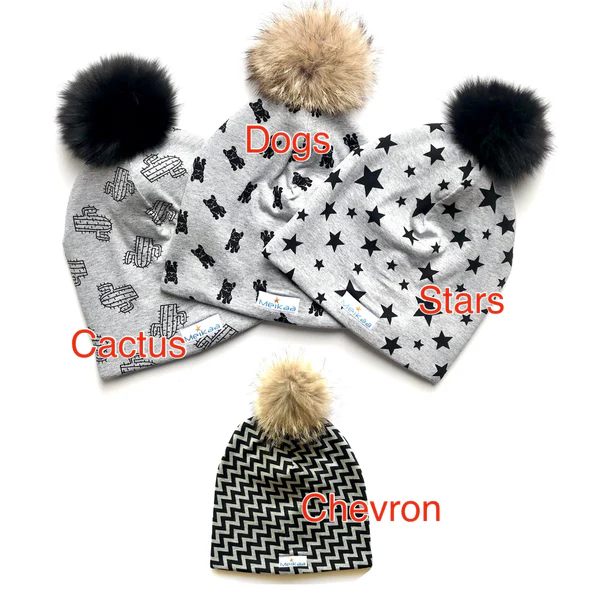This cute hat includes a recycled real fox fur pompom approx. 3-4 inches in diameter (3 pompom colours to choose from). Plus, to make it easier to wash, we added a snap fastener to the pompom. You can now wash your hat without washing your pompom.