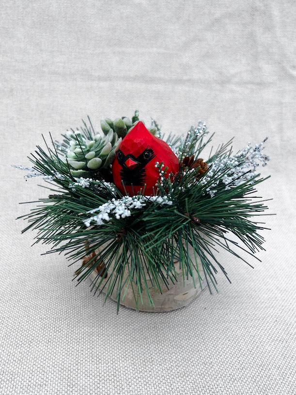 This little carved cardinal is safely nestled among the faux greenery atop a real birch log. Perfect arrangement to give a wintery touch to any small space.