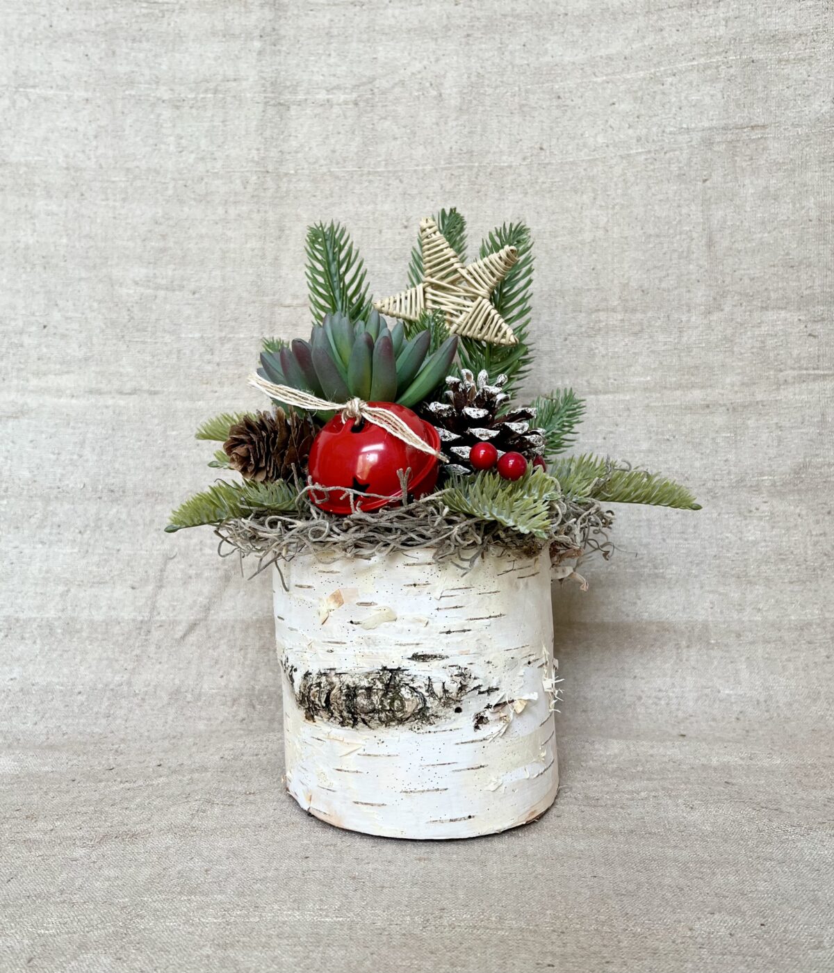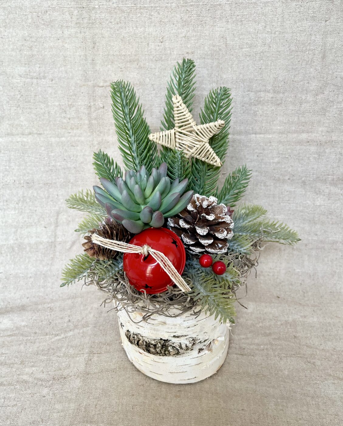 Designed on a chunk of real birch wood, this holiday design features life-like succulents and greenery. The wicker star, bright red bell and wintery pinecone complete this festive décor piece. Perfect for a thoughtful gift or that little spot that needs some wintery magic.
