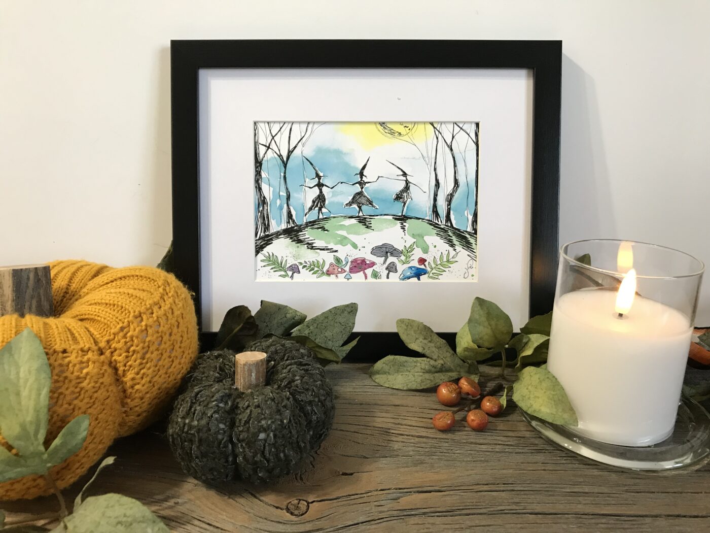 Part of my Halloween Collection. This piece captures the spirit of Halloween with 3 whimsical dancing witches in the moon light. Such a perfect decor piece for the mystical season and beyond. Micron ink pen and watercolour design.