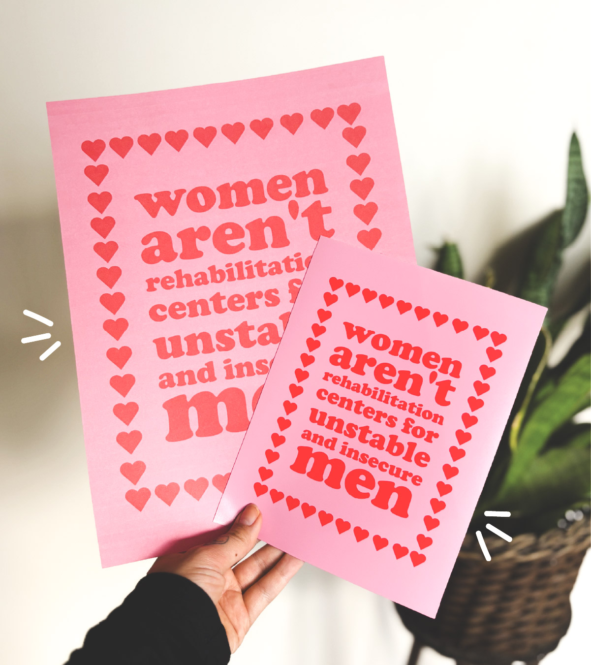 Make a bold statement in your space with this empowering typographic wall art print that reads: “Women aren’t rehabilitation centres for unstable and insecure men.” Designed in striking red lettering on a pink background, framed with a delicate heart border, this piece blends feminist strength with bold design.