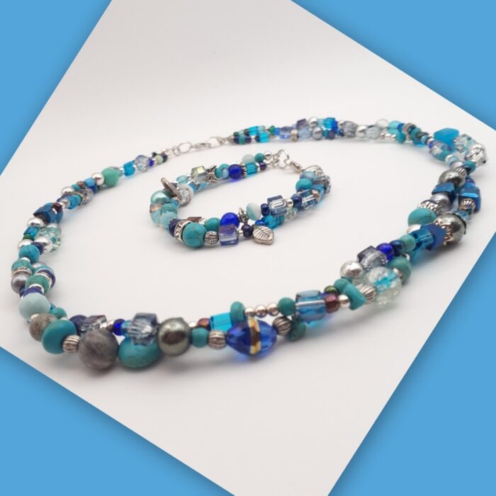 Beautiful blues bead soup twisted 2 strand 19 inch beaded necklace and bracelet matching jewelry set