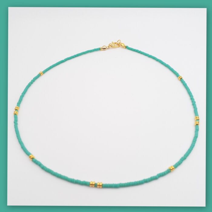 Turquoise Miyuki Glass Seed Bead and Gold Short Thin 16 inch Necklace